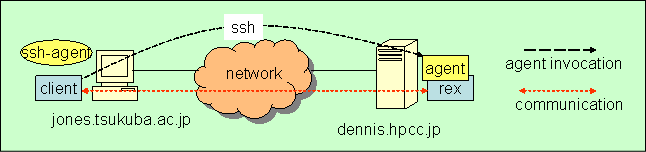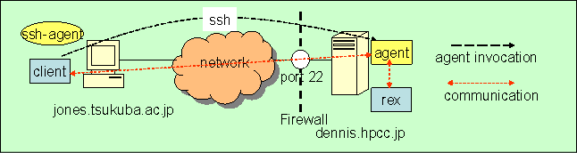 This description is for activating the agent with ssh. In this specification, the relationship between the agent and rex is shown below.